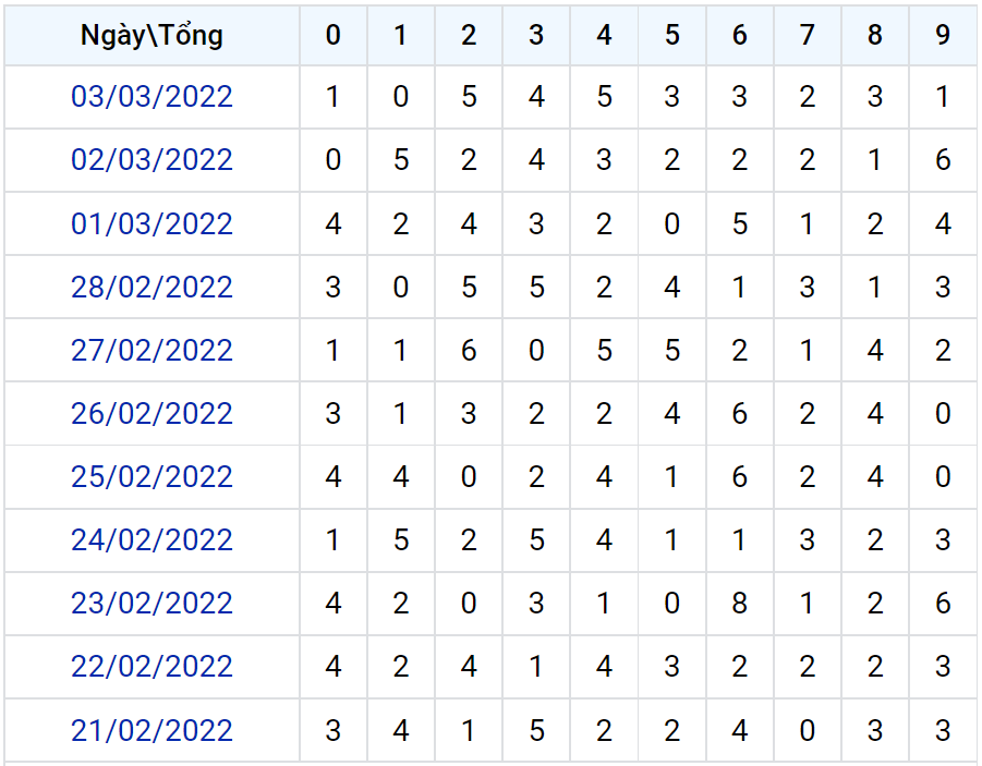 Thống kê loto XSMB theo tổng tính đến ngày 03/03/2022