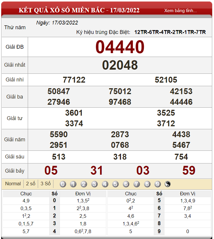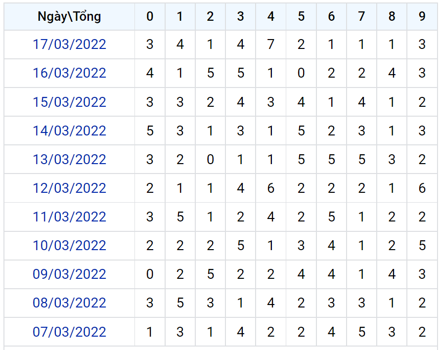 Thống kê loto XSMB theo tổng tính đến ngày 17/03/2022
