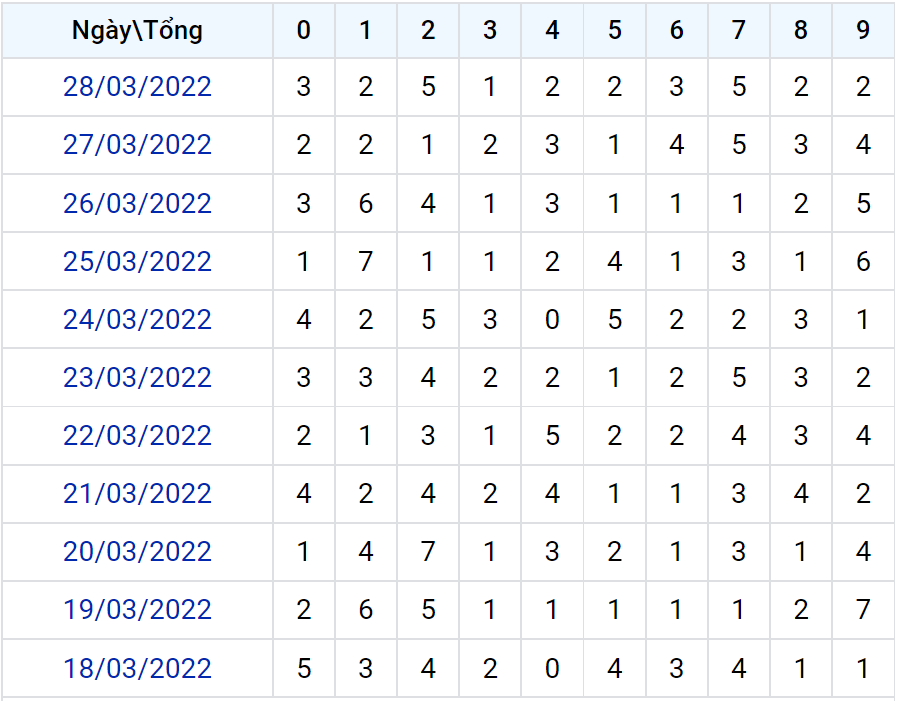 Thống kê loto XSMB theo tổng tính đến ngày 28/3/2022