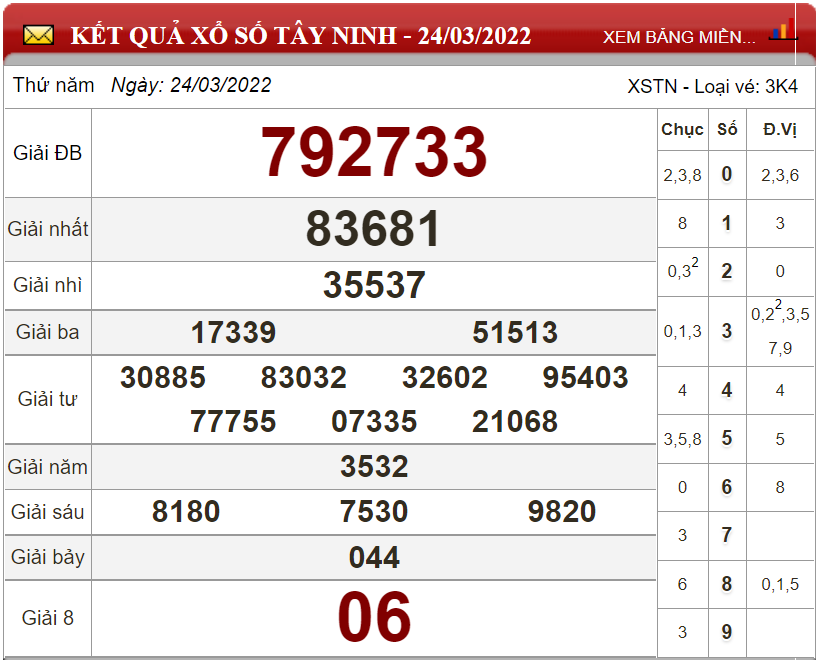 Kết quả lô đề theo xổ số Tây Ninh ngày 24/3/2022