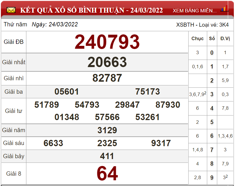 Kết quả lô đề theo xổ số Bình Thuận ngày 24/3/2022