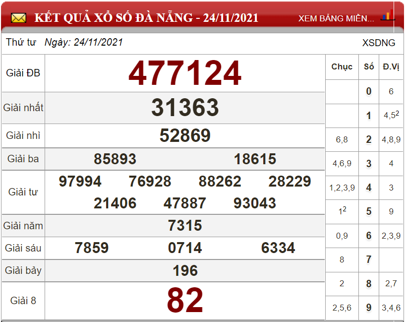 Kết quả lô đề theo xổ số Đà Nẵng ngày 24/11/2021