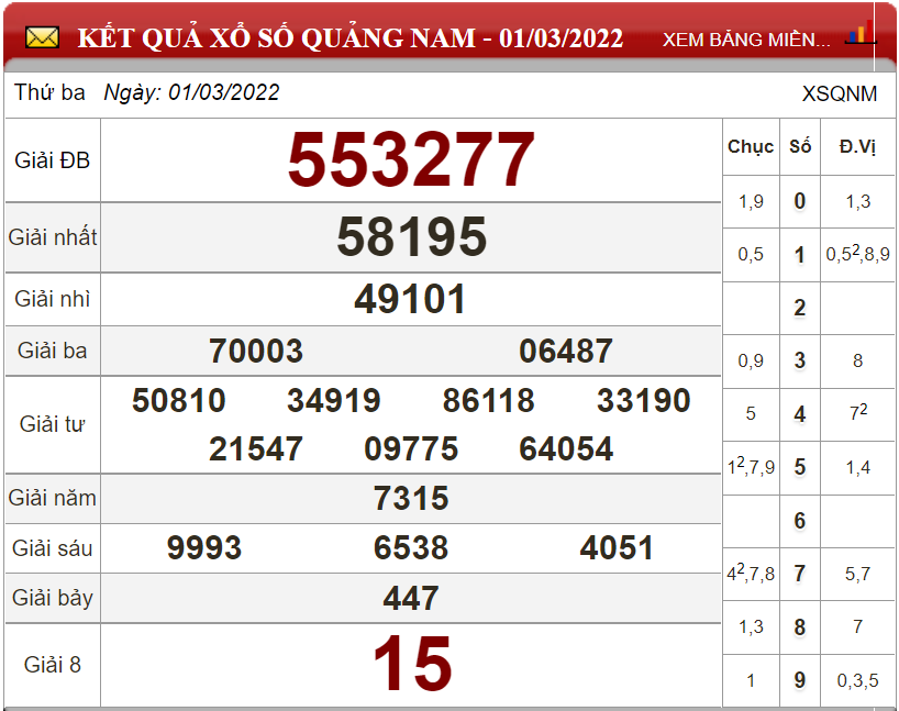 Kết quả lô đề theo xổ số Quảng Nam ngày 01/03/2022