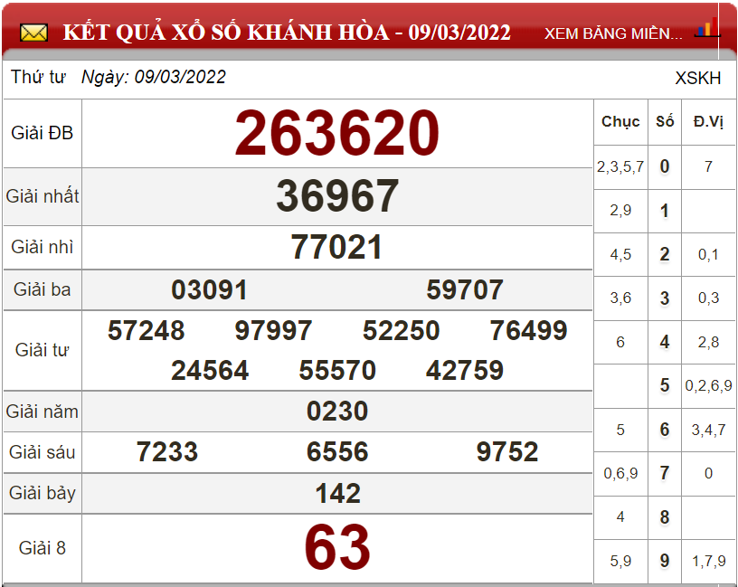 Kết quả lô đề theo xổ số Khánh Hòa ngày 09/03/2022