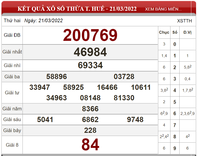 Kết quả lô đề theo xổ số Thừa T.Huế ngày 21/03/2022