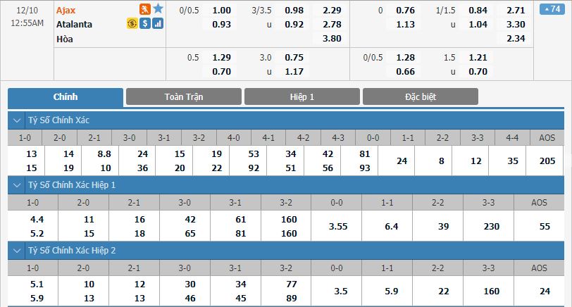 - Kèo tỉ số hiệp 1: Ajax 2-0 Atalanta