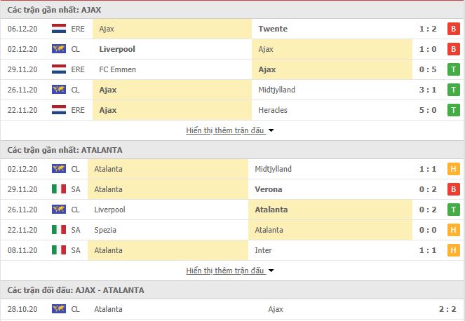 Phong độ gần đây & Thành tích đối đầu Ajax vs Atalanta
