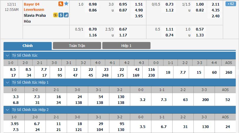 - Kèo tỉ số hiệp 1: Bayer Leverkusen 2-0 Slavia Prague