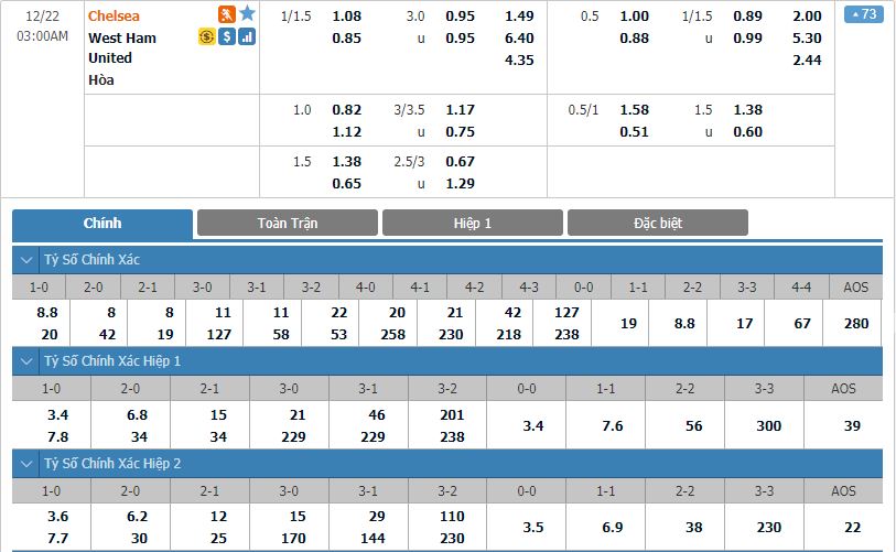 - Kèo tỉ số hiệp 1: Chelsea 1-1 West Ham