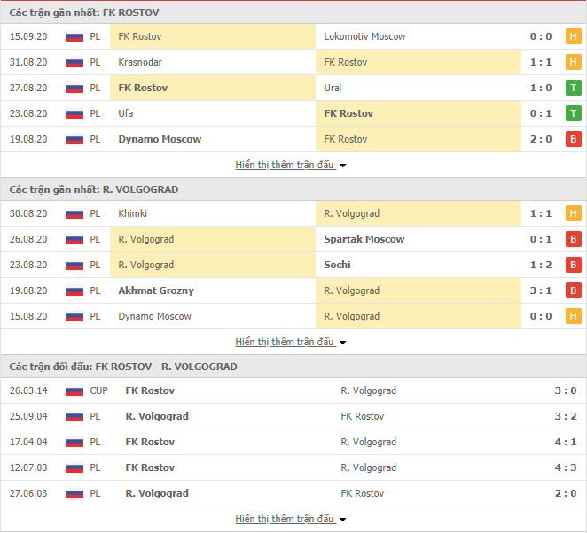 Phong độ gần đây & Thành tích đối đầu FC Rostov vs Rotor Volgograd