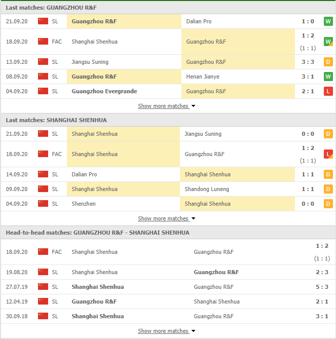 Lịch sử đang đứng về những người Thượng Hải. Thống kê từ 10 lần gặp nhau gần nhất chỉ ra Shanghai Shenhua có 5 chiến thắng, 2 trận hòa cùng 2 thất bại trước đội bóng của HLV Giovanni van Bronckhorst. Tuy nhiên ở thời điểm hiện tại, chắc chắn Shanghai Shenhua sẽ có 90 phút không hề dễ dàng trong lần tái đấu này.