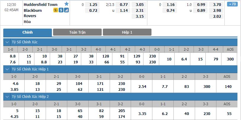 - Kèo tỉ số hiệp 1: Huddersfield 0-2 Blackburn