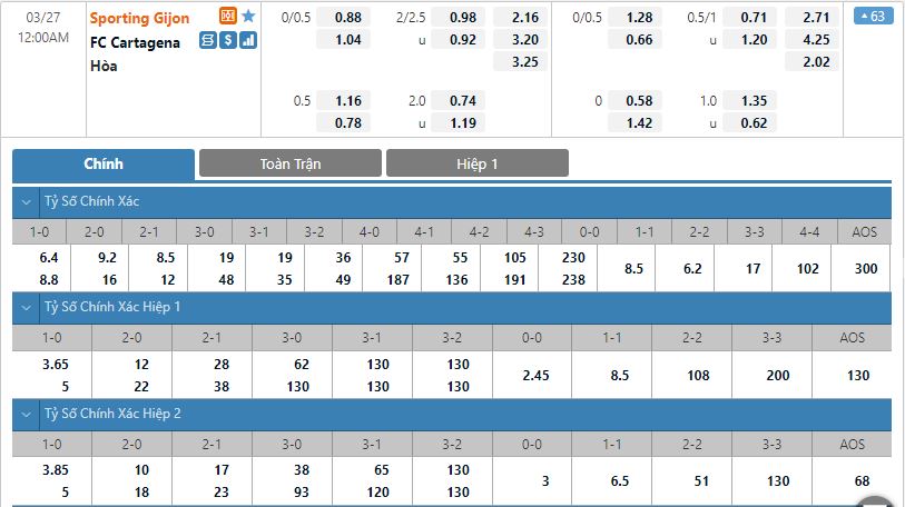 - Kèo tỉ số hiệp 1: Sporting Gijon 0-0 Cartagena