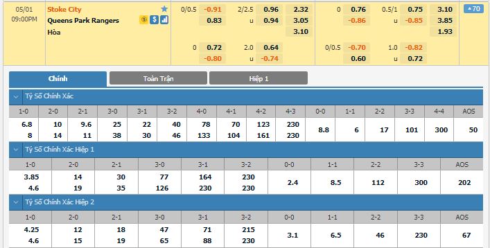 Bảng tỷ lệ kèo trực tuyến trận đấu Stoke City vs QPR: