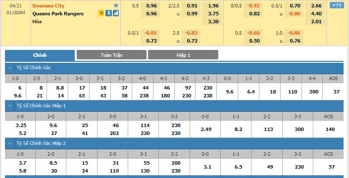 Bảng tỷ lệ kèo trực tuyến trận đấu Swansea vs QPR:
