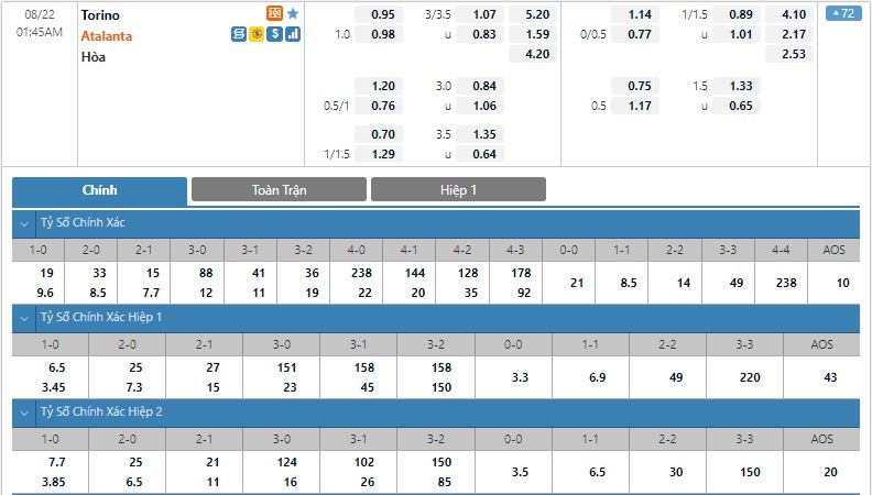 Bảng tỷ lệ kèo bóng đá Torino vs Atalanta