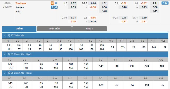 Bảng tỷ lệ kèo trực tuyến trận Toulouse vs Amiens: