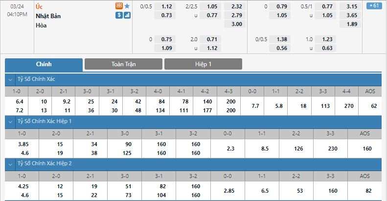 Bảng tỷ lệ kèo trực tuyến trận đấu Úc vs Nhật Bản