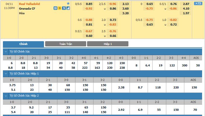 Bảng tỷ lệ kèo trực tuyến trận đấu Valladolid vs Granada:
