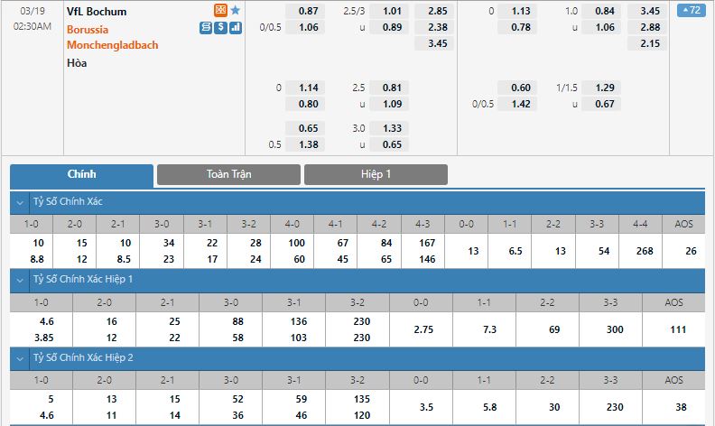 - Kèo tỉ số hiệp 1: VfL Bochum 0-0 Borussia Monchengladbach