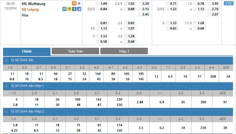 Bảng tỷ lệ kèo trực tuyến trận đấu VfL Wolfsburg vs RB Leipzig