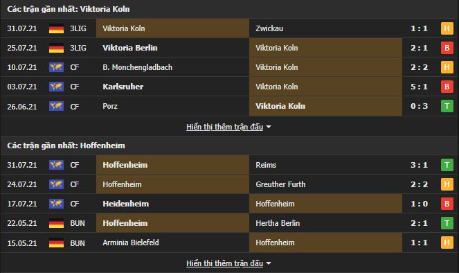 Phong độ gần đây Viktoria Koln vs Hoffenheim: