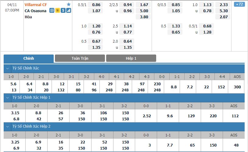 - Kèo tỉ số hiệp 1: Villarreal 1-0 Osasuna