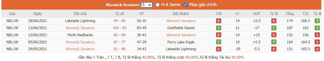 Phong độ gần đây Warwick Senators vs Rockingham Flames
