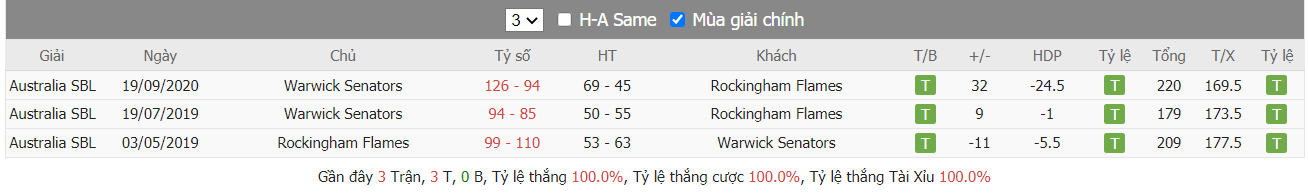 Thống kê về thành tích đối đầu của hai đội trong quá khứ, kết quả cho thấy không có được lợi thế sân bãi ở trận này Rockingham Flames vẫn được đánh giá cao hơn hẳn khi đã thắng tới 6 trên 9 lần chạm trán gần nhất của hai bên kể từ 12/2018 cho tới nay, trong đó còn có tới 5 trận cũng được diễn ra trên sân nhà của Rockingham Flames. Trong số đó ở lần chạm trán mới đây nhất hồi lượt trận mở màn trong mùa bóng mới, với lợi thế được ra sân ngay trên sân nhà Rockingham Flames đã giành được chiến thắng 113 – 107 khi tiếp đón chính Warwick Senators. Như vậy với lợi thế được ra sân ngay trên sân nhà, Rockingham Flames tiếp tục sẽ là sự lựa chọn sáng hơn hẳn khi mà đội chủ nhà đã mang đến niềm vui cho các nhà đầu tư trong 4 trận ra sân mới đây nhất.