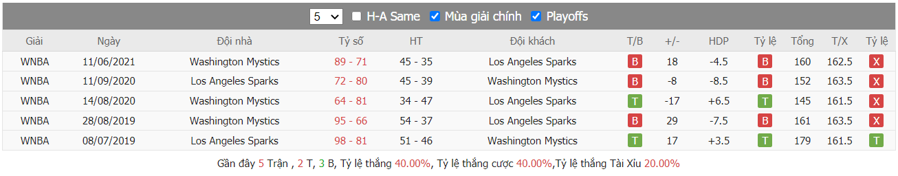Thành tích đối đầu Washington Mystics vs Los Angeles Sparks
