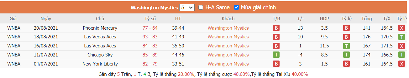 Trước khi bước vào trận đấu này Washington Mystics vẫn đang trình diễn được một phong độ khá ổn định khi đã toàn thắng được trong tổng số 3 trận ra sân liên tiếp trước đó cũng tại đấu trường giải quốc nội, trong số đó ở trận ra sân mới đây nhất Washington Mystics đã thành công giành được chiến thắng 90-81 trong chuyến hành quân trên sân nhà của Indiana Fever. Qua đó cho thấy với phong độ thuyết phục kể từ đầu mùa đã giúp Washington Mystics vẫn đang là đội bóng có thành tích ấn tượng nhất khi vẫn đang dẫn đầu trên BXH khi đã giành được 26 chiến thắng sau tổng số 33 trận đã đấu kể từ đầu mùa. Tuy nhiên ở một khía cạnh khác, mặc dù Washington Mystics sẽ sở hữu được lợi thế ra sân ngay trên sân nhà ở trận tới, nhưng giới đầu tư vẫn nên cân nhắc khi đặt niềm tin vào Washington Mystics bởi đội bóng này chỉ mới giành được vỏn vẹn 2 chiến thắng về kèo theo TLCA trên tổng số 8 lần gần nhất đón khách được ra sân ngay trên sân nhà, còn lại là 1 trận hòa kèo và 5 lần phải nhận thất bại.
