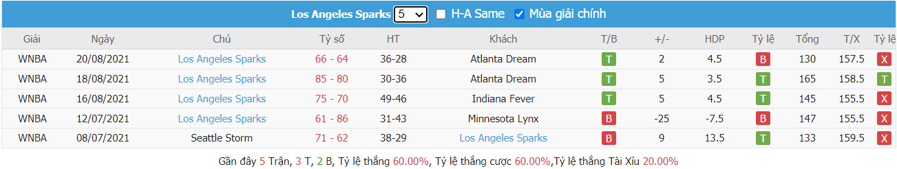 - Phong độ Los Angeles Sparks