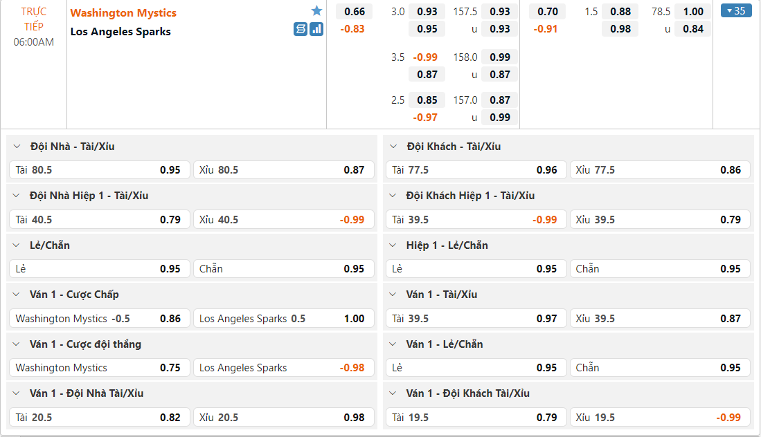 Bảng tỷ lệ kèo Washington Mystics vs Los Angeles Sparks