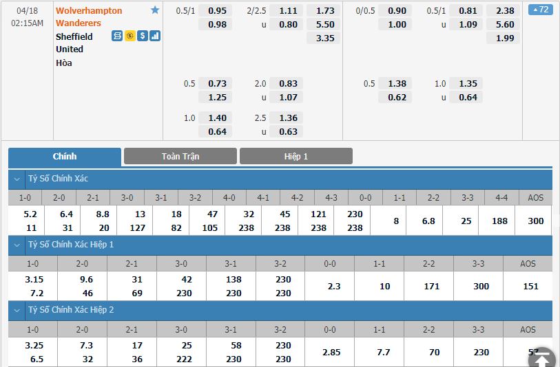 Bảng tỷ lệ kèo trực tuyến trận đấu Wolves vs Sheffield United