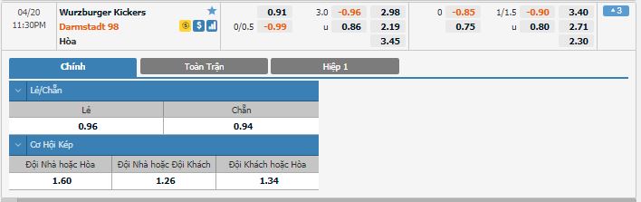 Bảng tỷ lệ kèo trực tuyến trận đấu Wurzburger Kickers vs Darmstadt 98: