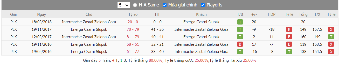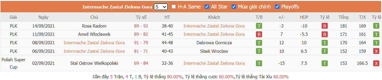Thành tích đối đầu Zastal Zielona Góra vs STK Czarni Słupsk
